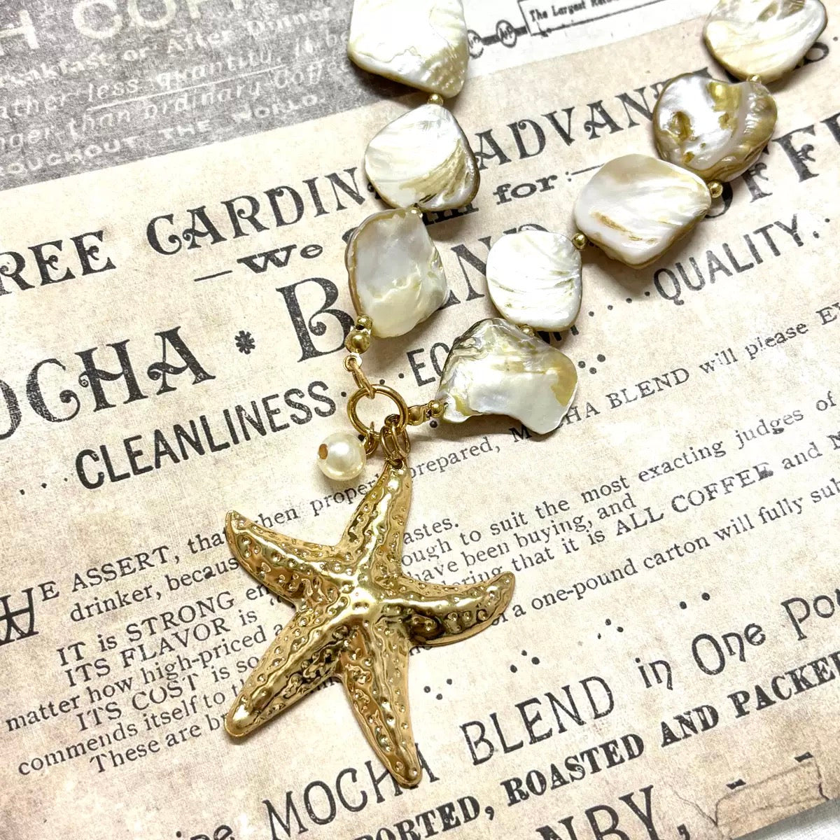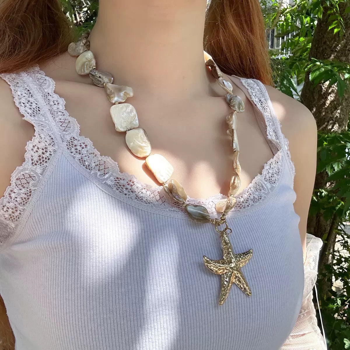 This necklace features a charming design. The beads are made of natural shell, showcasing a lovely off - white and beige color palette, reminiscent of the gentle hues of seashells found on the shore. The centerpiece is a gold - toned starfish pendant, a classic sea - inspired element that evokes the beauty of the ocean. The combination of shell beads and the starfish creates a perfect seaside - themed accessory, bringing a touch of the ocean's charm to your style.